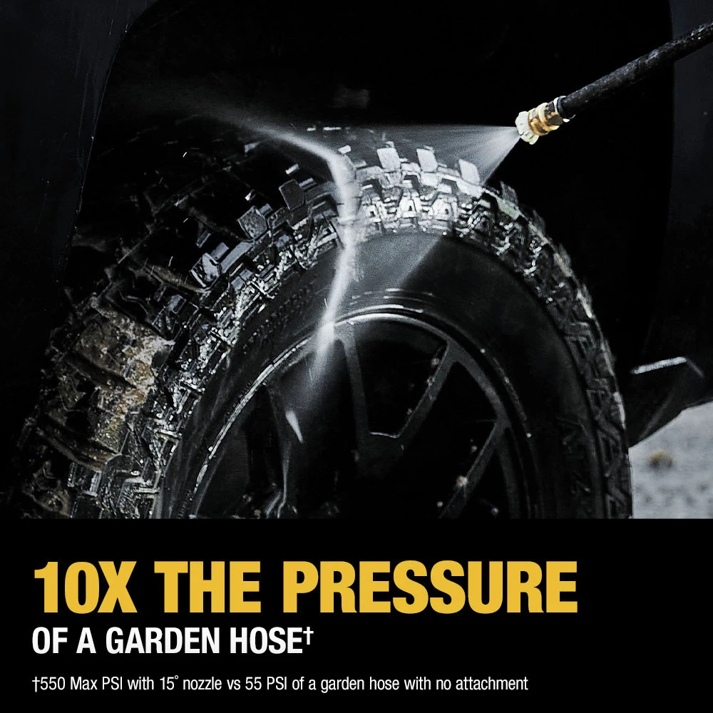 - The DEWALT DCPW550B 20V MAX Cordless Pressure Washer delivers 550 PSI of power for efficient outdoor cleaning without the hassle of cords or gas. Perfect for decks, patios, and vehicles.